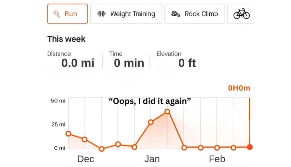 If your training looks a little like this then it is worthwhile to zoom out and focus on your goals and where you want to be in 6 weeks time. Shooting up from a small number of miles to suddenly hitting 50km weeks is a recipe for overtraining and injury. This is often quite easy to do in the sense that we’re feeling good and fresh from the Christmas break, everyone is on their New Year health kick and you may get swept away supporting others or enjoying the buzz around running and cycling. Look back at the end of the week and you’ve suddenly clocked up double the amount you were used to doing.