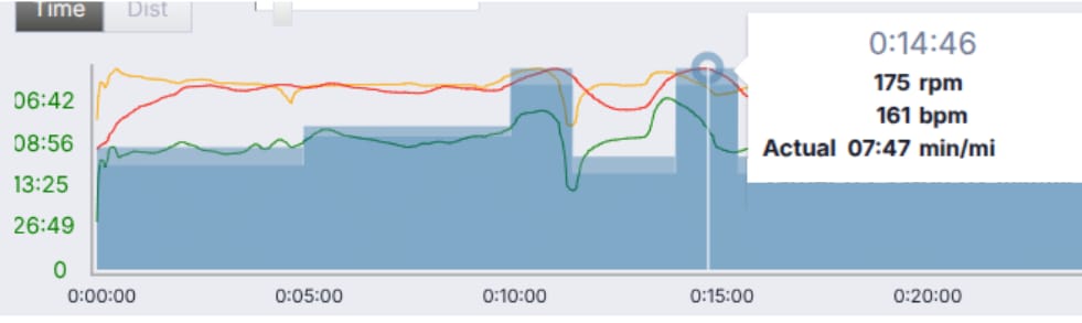 That’s over 1,000 strides across the 6× 1 minute intervals and again, lots of muscular work.