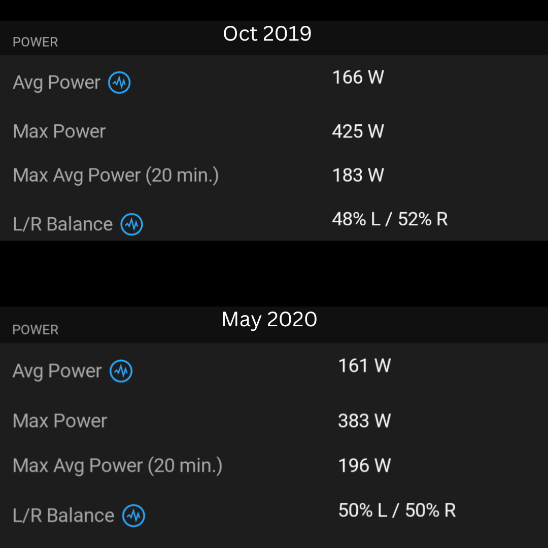 After I broke my back my left hip, my left leg was substantially weaker than my right- I had roughly a 60/40 power split between my right left to my left leg. I didn’t focus on an abundance of single leg cycling with my left leg, although I certainly did some. My main focus was getting that strength back using weights and working on one leg to challenge my body in a way that it wasn’t getting from cycling alone, nor from just doing loads of double-legged squats where my right leg overcompensated. Here in 2019, we can see there is still a 2% difference in the L/R Balance, yet in 2020 that’s back to a 50/50 split. I’m back at that 50/50 split due to strengthening my left leg independently as part of a strength program where I am of course working to get stronger across the board.